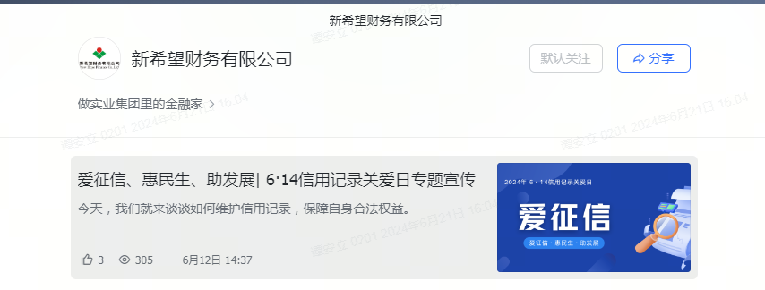 一是通过公众号、订阅号推送征信知识。6月12日至14日期间,财务公司分别在新希望集团内部订阅号及微信