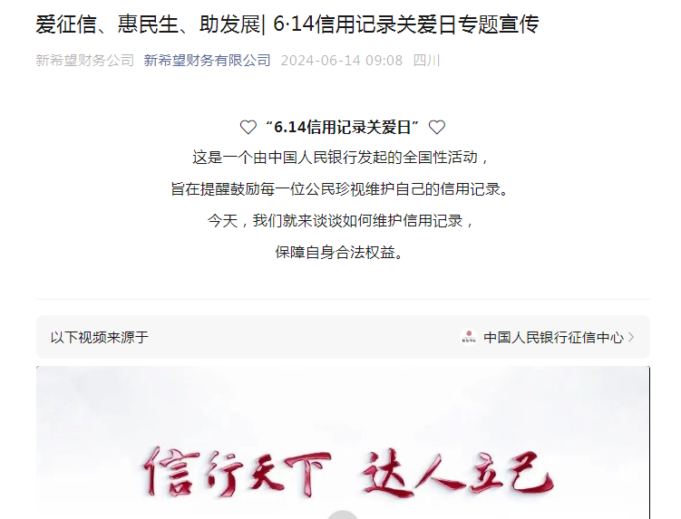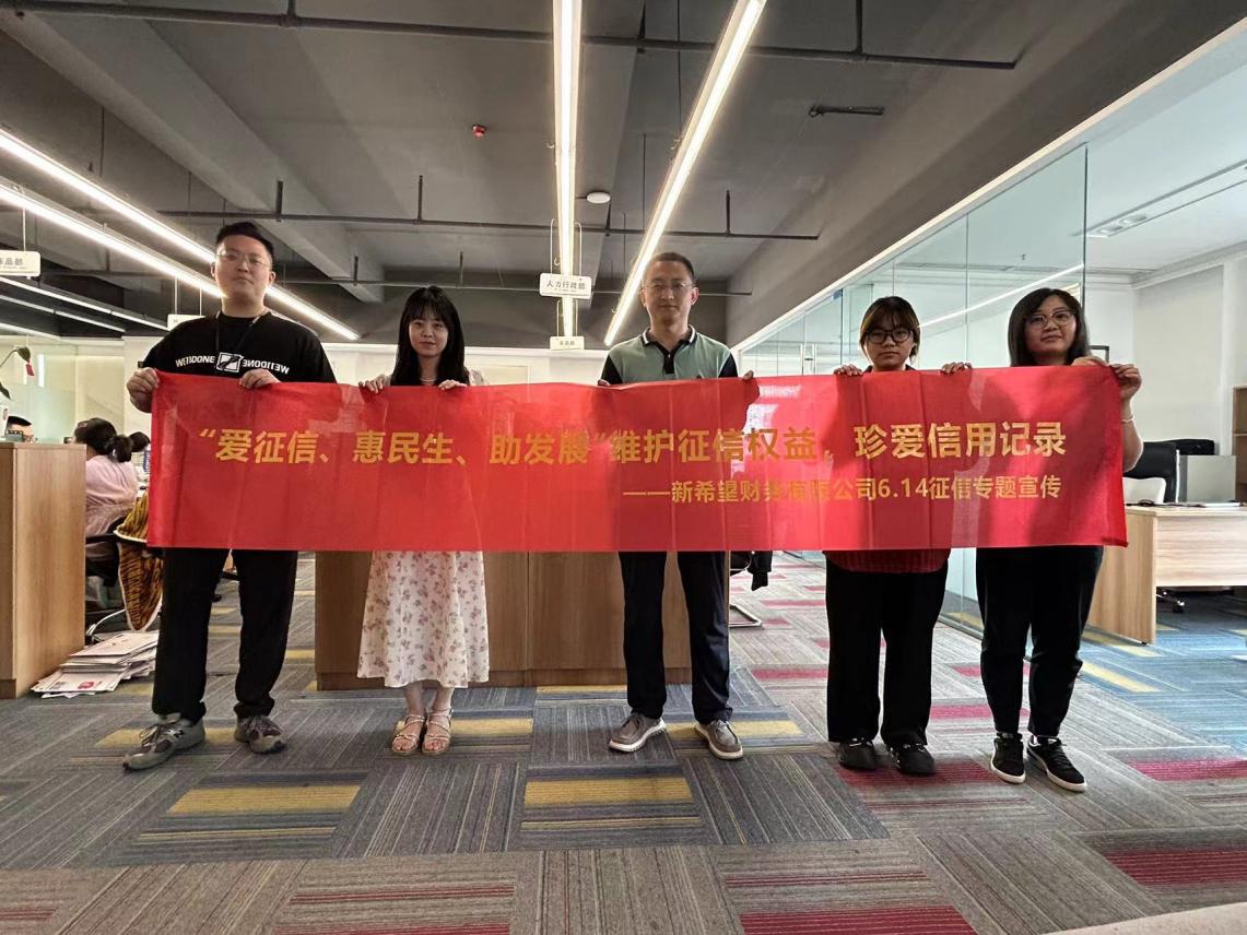 题“爱征信、惠民生、助发展”,积极组织开展‘6·14’信用记录关爱日”主题宣传活动,向新希望集团成员单位