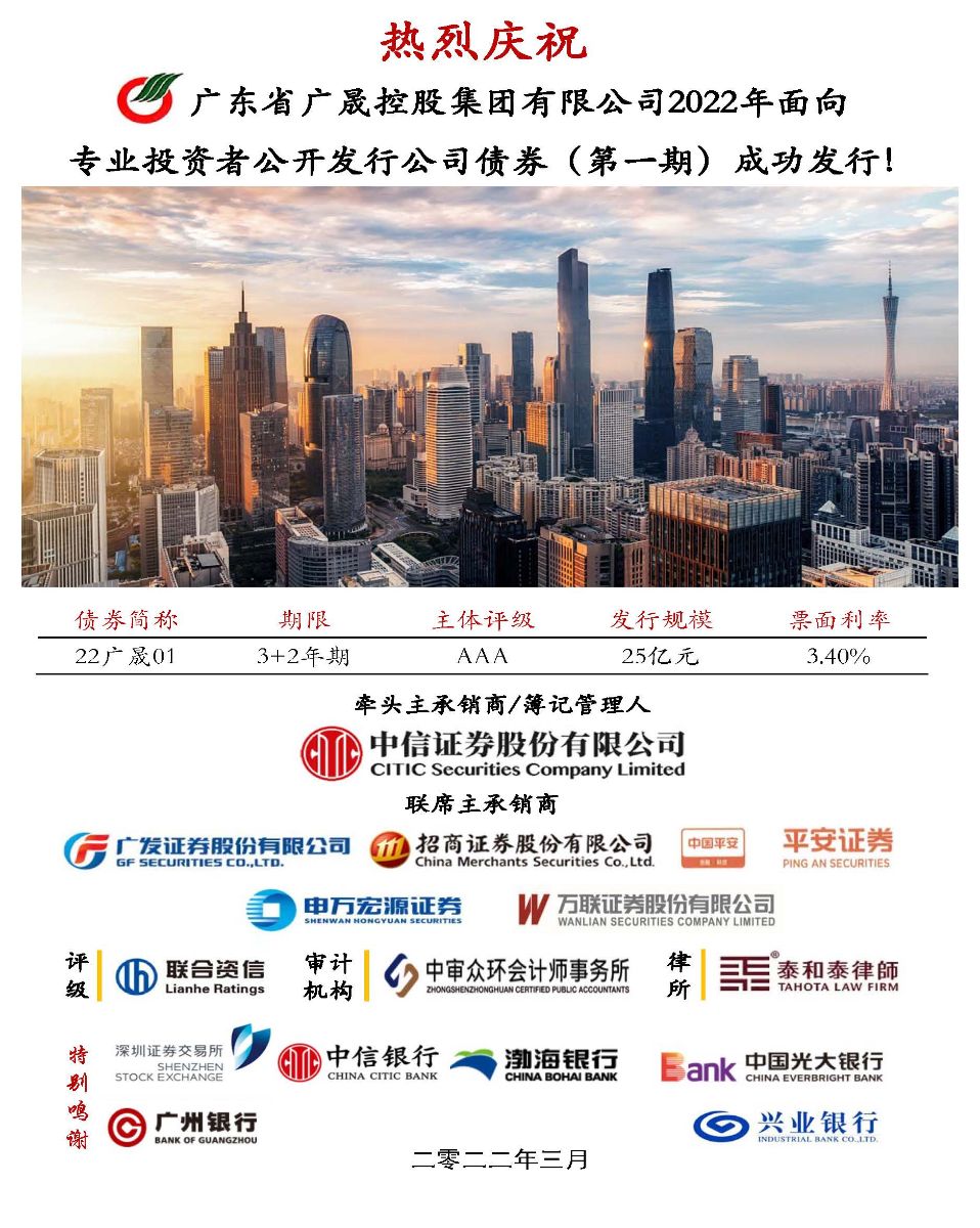 3月10日,广晟集团2022年首期公司债券(22广晟01)顺利发行,发行规模25亿元,发行期限3+2年期,创2022年以来广东省3A级国有企业公司债券最大发行规模。