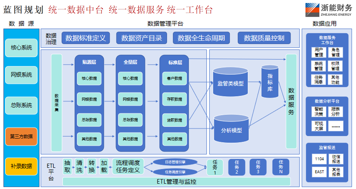 数据中台深化应用项目是浙能财务继核心业务系统全面升级后,进一步提升精细化管理水平、强化数据驱动的业务洞察与风险预警能力的关键举措,旨在进一步完善数据治理体系并扩大数据接入范围,重点构建智能化决策分析、自助式报表分析、实时动态大屏监控、全流程监管报送等一系列数据应用,为经营管理和决策分析提供坚实的数据。