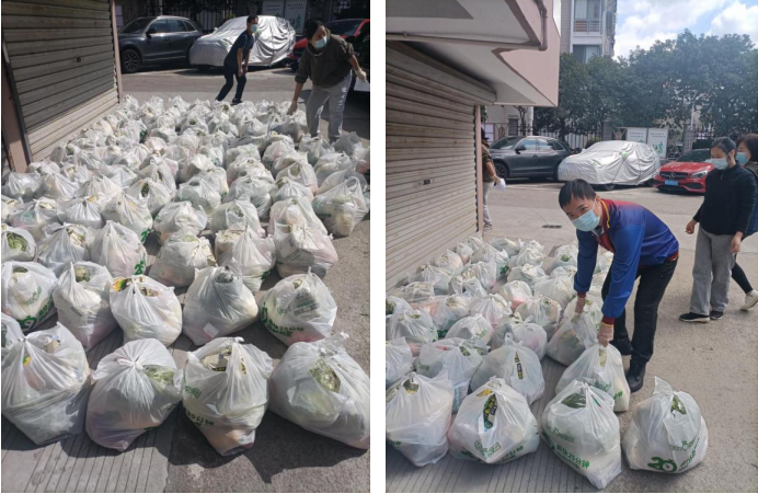 120袋的“爱心菜”堆满一地,这是10月19日北仑杜鹃社区志愿者送菜上门行动的现场。没错,我就是“6人