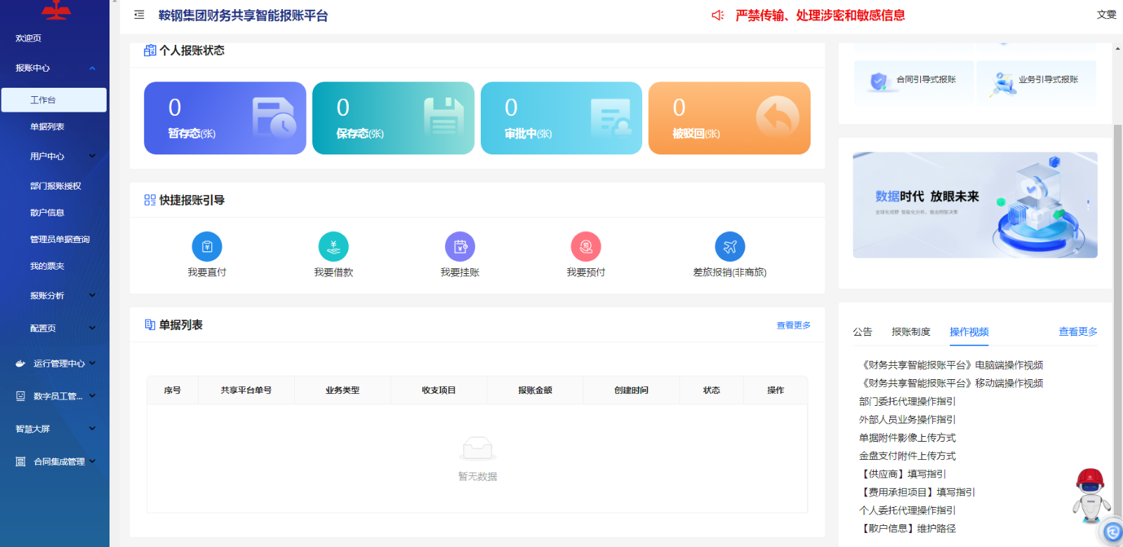 新一代财务智能报账系统上线实现了财务报销的“五化目标”即报账入口统一化、基础信息规范化、报销标准透明化、报账业务流程化、报账数据可视化。