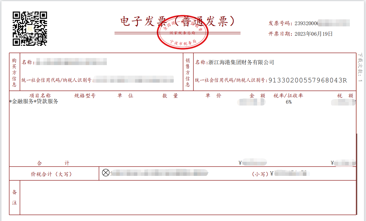 6月19日,浙江海港集团财务公司(下称“财务公司”)通过电子税务局平台开具了首张全面数字化的电子