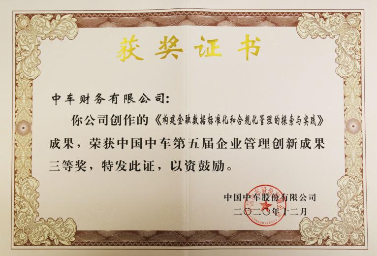 根据《中国中车股份有限公司管理创新成果审定和发布办法》,中国中车管理创新成果审定委员会审定结果中,公司创作的《构建金融数据标准化和合规化管理的探索与实践》成果,荣获中国中车第五届企业管理创新成果三等奖。