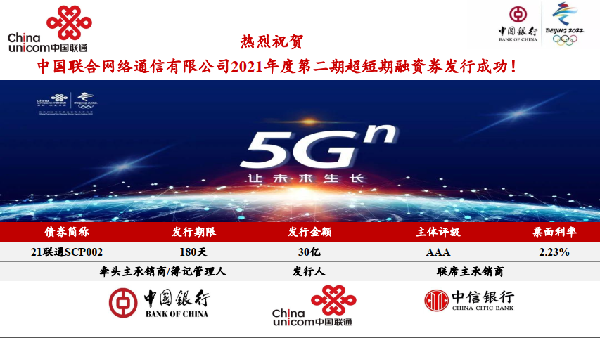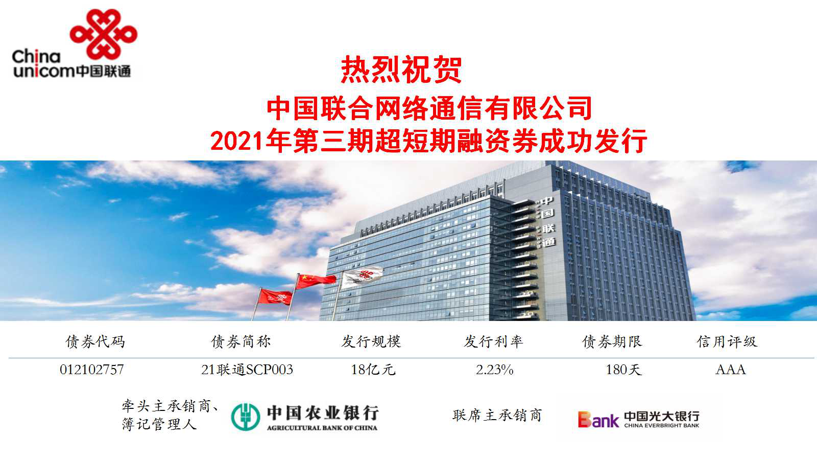 2021年7月29日,联通集团财务有限公司作为财务顾问,助力集团在银行间市场成功完成21联通SCP002及21联通SCP003两期超短期融资债券的发行工作,债券发行期限6个月,合计募集规模48亿元,发行利率2.23%。本次超短期融资债券的发行利率创下了2021年以来全市场同期限超短期融资债券票面利率的新低,较同期贷款基准利率下浮162bp,节约融资成本约3,888万元。
