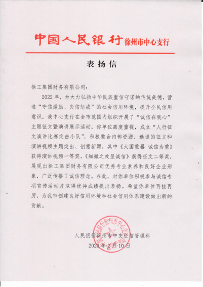 在2022年中国人民银行徐州市中心支行组织开展的“诚信在我心”主题征文暨演讲展示活动中,我公