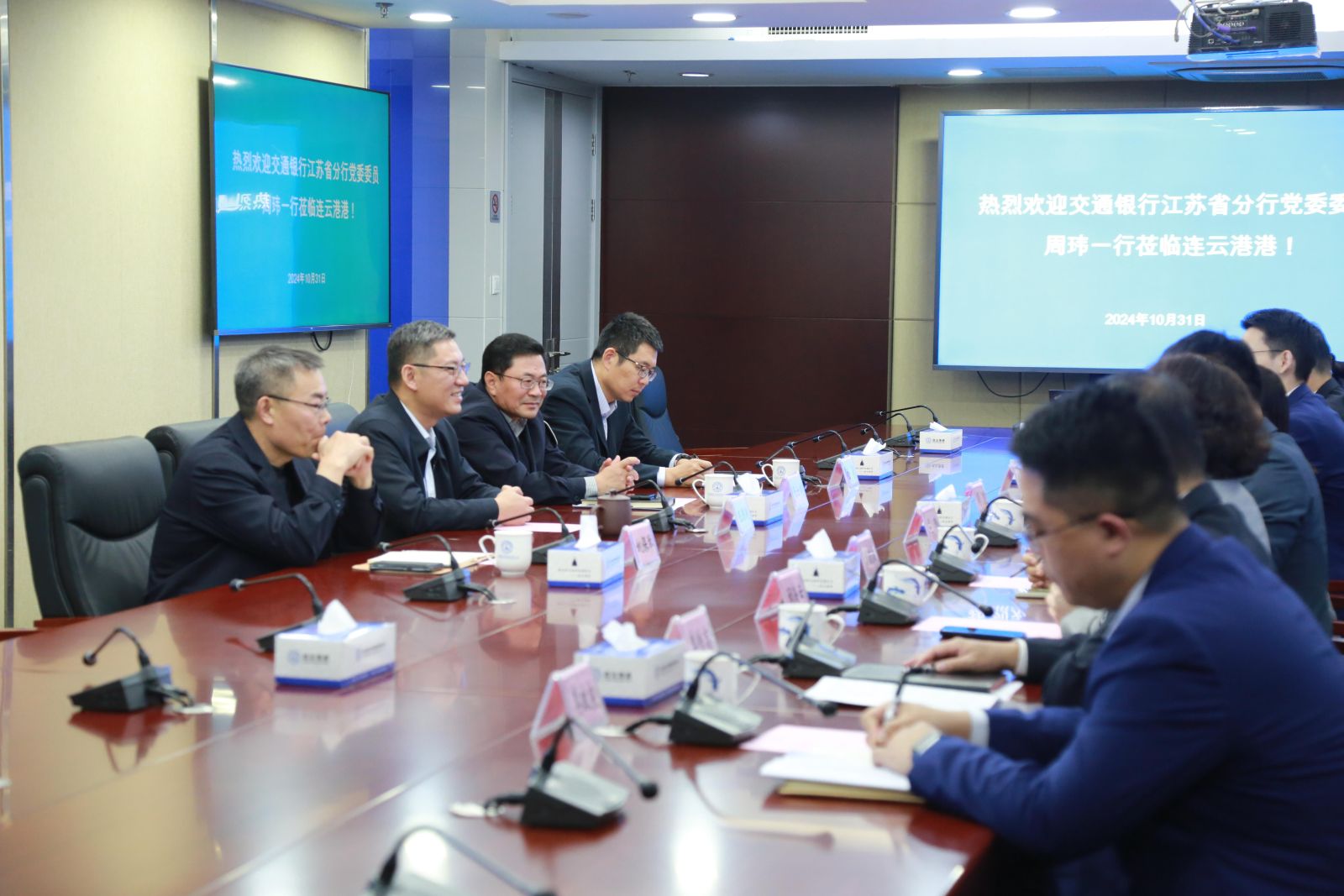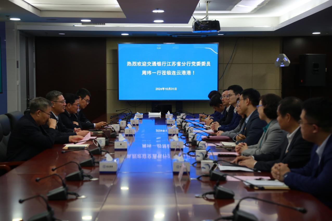 10月31日,交通银行江苏省分行党委委员周玮一行莅临连云港港口集团调研交流,集团总裁王国超、总会