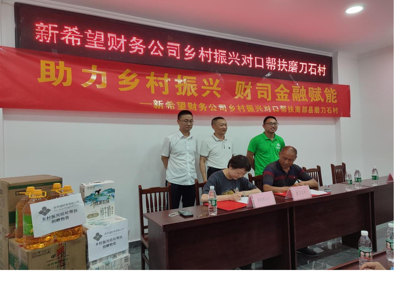 2022年6月9日,新希望财务有限公司会同新希望六和股份有限公司新六纵队前往四川省南部县谢河镇磨刀石村开展“助力乡村振兴、财司金融赋能”结对帮扶签约活动。新希望财务公司与磨刀石村就定点产业帮扶、金融知识普及宣传、村干部及村民技能培训、党建共建等几方面达成一致意见,顺利签署帮扶协议。
