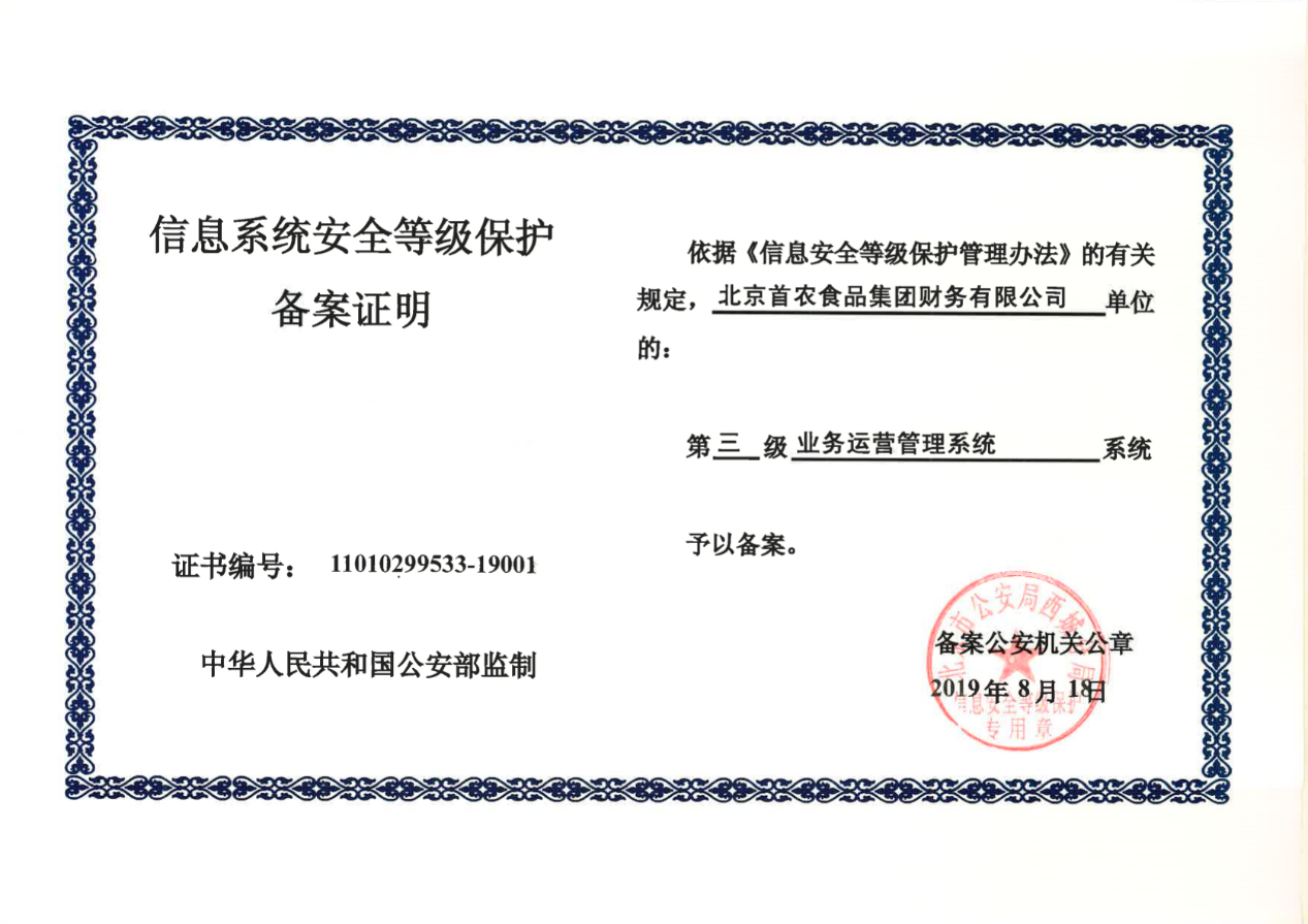 首农食品财务公司应用的业务运营管理系统经过立项、招投标、定级、评审、整改、测评、报备等工作环节,于8月18日顺利取得了西城公安分局的备案证明。在这项工作中,财务公司按照等级保护三级的标准立项,完成了信息安全基线和安全管理制度的重新梳理,特别是全面的测评工作和包括系统加固、安全设备集成等整改工作,进一步提升了信息安全管理水平。